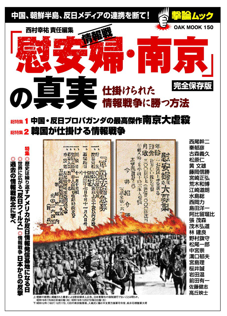 ≪一方的侵略史観を見直せ≫ この度の尖閣事件は、中国共産党の指令を受けた海上民兵(ゲリラ)による 日本の領土への直接侵略の準備工作だった疑いがある。 国民が衝撃を受けたのは、現政権に侵略を阻止する意思も能力もないことが 露呈したからだ。 中国は「あしき隣人」だという、国民の標準的な思いを代弁しただけの 党内の声にあえて反論して、仙谷由人官房長官は、 「中国から伝来した文化が基本となり日本の文化・文明を形成している」とし、 戦前の日本が「侵略によって中国に迷惑をかけた」と述べて中国を擁護した。 反日・自虐史観によって洗脳され、「日本の支配者、指導者」となった人物の 絵に描いたような姿がここにある。 仙谷発言は、対中弱腰外交の根源に中韓隷属史観・日本侵略史観があることを 明瞭に示している。 暴力革命と平和革命の関係は直接侵略と間接侵略の関係に似ている。 今日、暴力革命を公然と唱える政党はないが、 平和革命は国家と社会の腐食・解体として長期にわたり深く進行している。 同様に、中国の直接侵略を肯定する政党はないが、 反日教科書や外国人参政権の形をとった間接侵略を 受け入れ推進している政党が複数存在する。 われわれは両方の形式の侵略を正視しなければならない。 しかし、尖閣事件を契機にして国民の中国認識は劇的に変わりつつある。 白を黒と言い張る暴虐無礼な中国の正体を知った国民は、 戦前の日中関係についても、やがて一方的な日本侵略史観を見直すだろう。 それをしっかりと形にできるかどうかは、 歴史教科書の根本的改善にかかっている。(ふじおか のぶかつ)